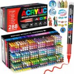 La boîte renferme 288 feutres acryliques de très bonne qualité, numérotés et couvrant un large panel complet de couleurs. Il y a de tout, y compris un noir et des teintes de peau. À quelques exceptions près, les couleurs sont organisées dans des casiers et regroupées par teinte (les verts avec les verts, les bleus avec les bleus, etc.). Chaque feutre a les extrémités d’une couleur fidèle à sa couleur réelle. La pointe pinceau est précise et agréable, quel que soit le support utilisé (du papier au bois en passant par le verre, le plastique, le tissu, etc.). Pour le…